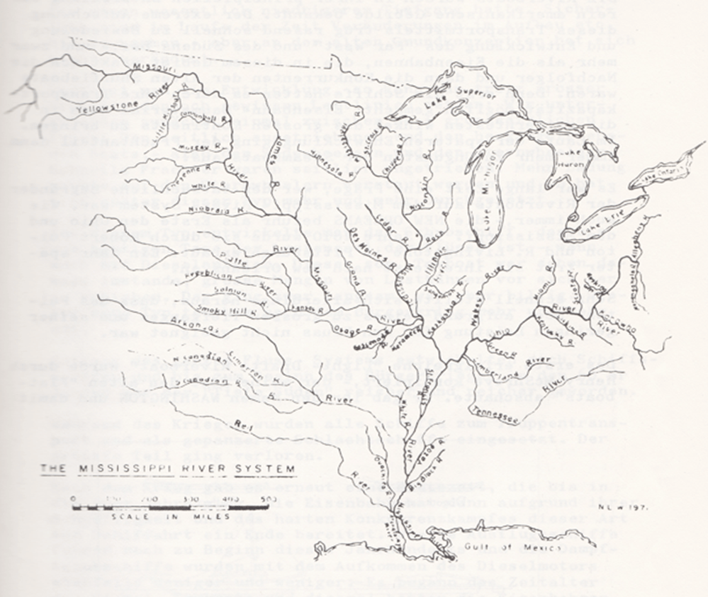 boom of this transport medium contributed the very fast settlement of the „Far West“ and the south, – and for sure more than the railways, which became the successors and later the competitors of the old shuffleboats. Because first the boats with their transport capacity made it possible, to bring railway- buildingmaterial even to the most distanced corners of this big continent. During the later development the