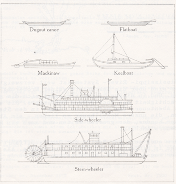 The era of the Flatboats, Mackinaws and Keelboats is comin to an end. Since the wave of immigration, they have served as a means of transport alongside the canoe. Their owners have adapted to the rigors of the overgrown and pristine river courses. Sandbars, today here, tomorrow there, driftwood islands, tree trunks, snages, rapids, reefs and vortex, floods and low water depending of the season, also attacks of Indians.