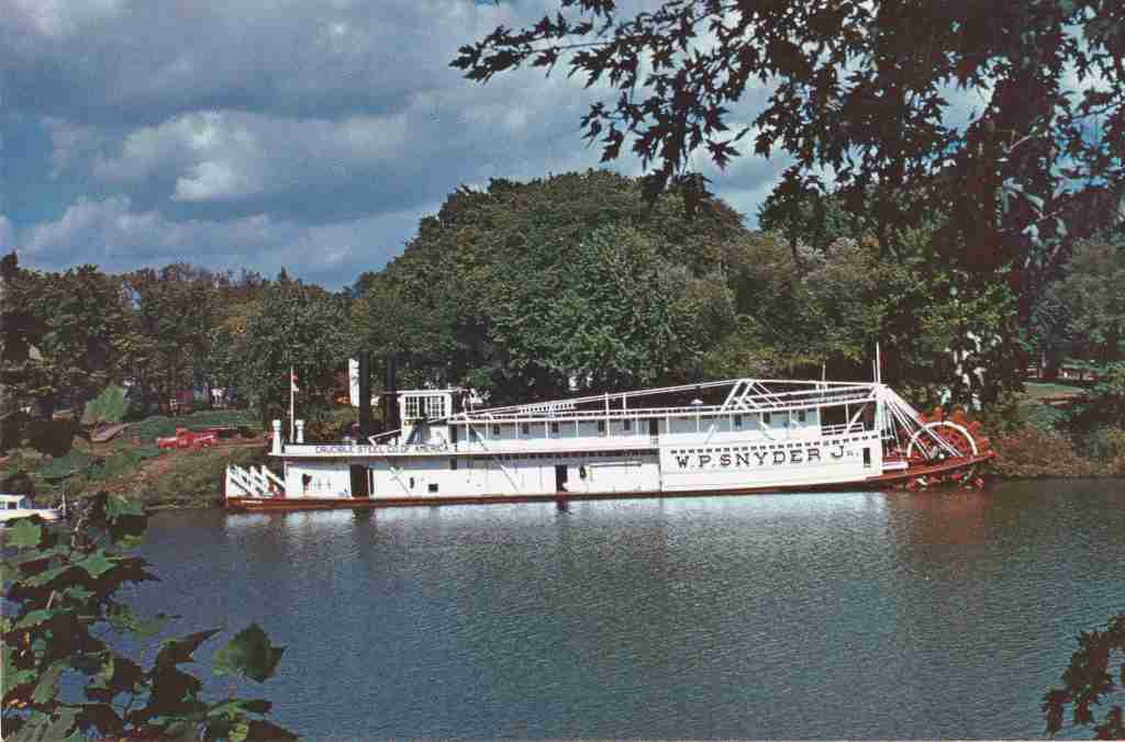 The River Museum at Marietta was sponsored by the Sons and Daughters of Pioneer Rivermen and this organization has been responsible for the elaborate display of the many scale models, photographs, paintings, and other notable memorabilia of the glamorous steamboat age on the Ohio and Mississippi Rivers. The W. P. SYNDER, paddle wheel is 21 feet in diameter and she is known as a „Poolboat“ with the pilot house set forward on the second deck with two hinged smokestacks which enable her to clear the low bridges in the Monongahela River. The pilot wheel is 11 feet in diameter with a 7ft. stroke, generating 750 H. P. The SNYDER has four „Western River Boilers“ 28 feet long and 40″ in diameter using automatic stocker-fed bitumionous coal. The SNYDER while modern in many respects retains the 19th Century characteristics of the Mark Twain era with such innovations as engine room bells, „hog.chain“ supports and general cabin and stateroom construction. It is one of the last of the great proud fleet of steamboats which brought prosperity and a rich tradition to the great Ohio River Valley.